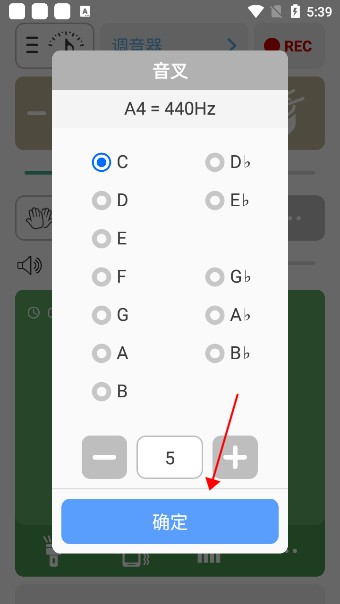 2、箭头往左表示音低了,箭头往右表示音高了,箭头在正中间变成绿色音就准了!