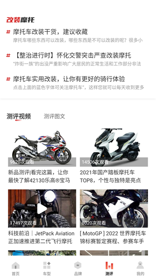 2、软件上还有大量的摩托车评测,用户可以观看到最详细的摩托车使用体验。