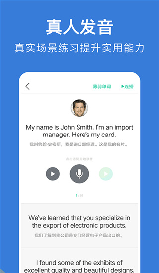 您可以和外教进行模拟实景会话练习,您选择一个角色来扮演,app可以将您的虚拟会话录音并回放,提升您口语的实用能力。