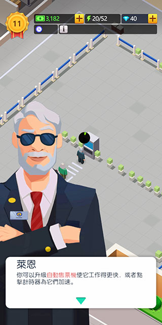 3、旅客前往火车站的第一件事就是需要购票,我们可以通过升级购票机,或者点击头顶计时器加快旅客购票速度。