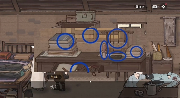 2、接着离开屋子,触发相应剧情,并会有阿福加入队伍,之后需要查看书桌。