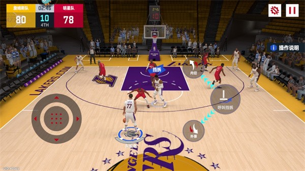 3、游戏操作相对来说较复杂,需要玩家多玩几局,熟练一下,游戏界面右侧为投篮、呼叫挡拆、传球、运球/背打。