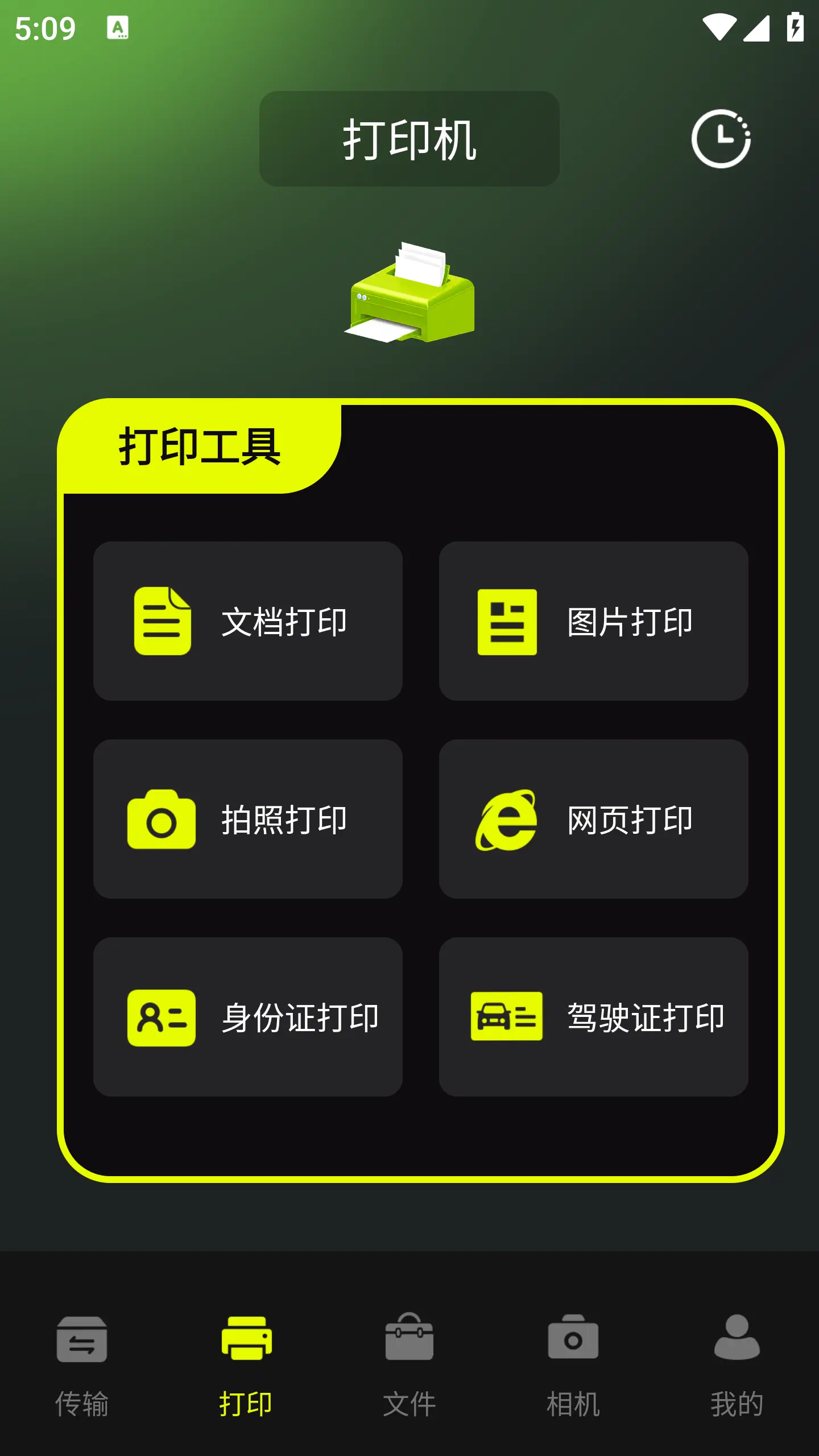 2、在主页面选择"打印机选择"功能入口,进入设备连接管理界面。