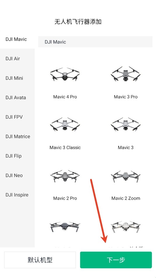 2、在这里进行无人机飞行器添加,选择你当前的机型,就可以点击下一步了。