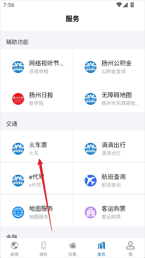 2、在服务页面中,向下滑动找到【火车票】功能并点击进入;