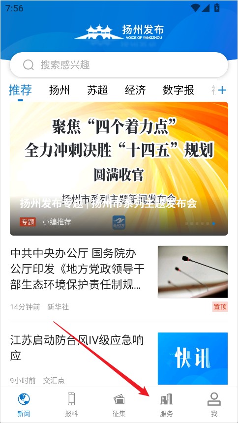 1、打开扬州发布App,点击底部导航栏中的【服务】入口;