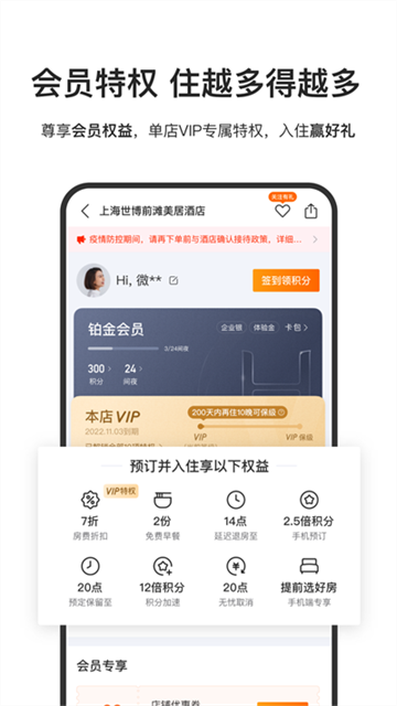 华住会旗下酒店遍布16个国家,1000多个城市,拥有汉庭、全季、宜必思、桔子、漫心、美居、花间堂等30多个国内外酒店品牌的7900多家酒店,满足用户从高端到平价,商务到度假的多元需求。用户定位后可以查看附近华住会旗下酒店,通过分类以及筛选价格、位置距离等属性后,可以浏览所有符合要求的酒店,使用起来十分方便。此外,成为华住会会员可以累计积分,积分可以兑换早餐、折扣等优惠服务。