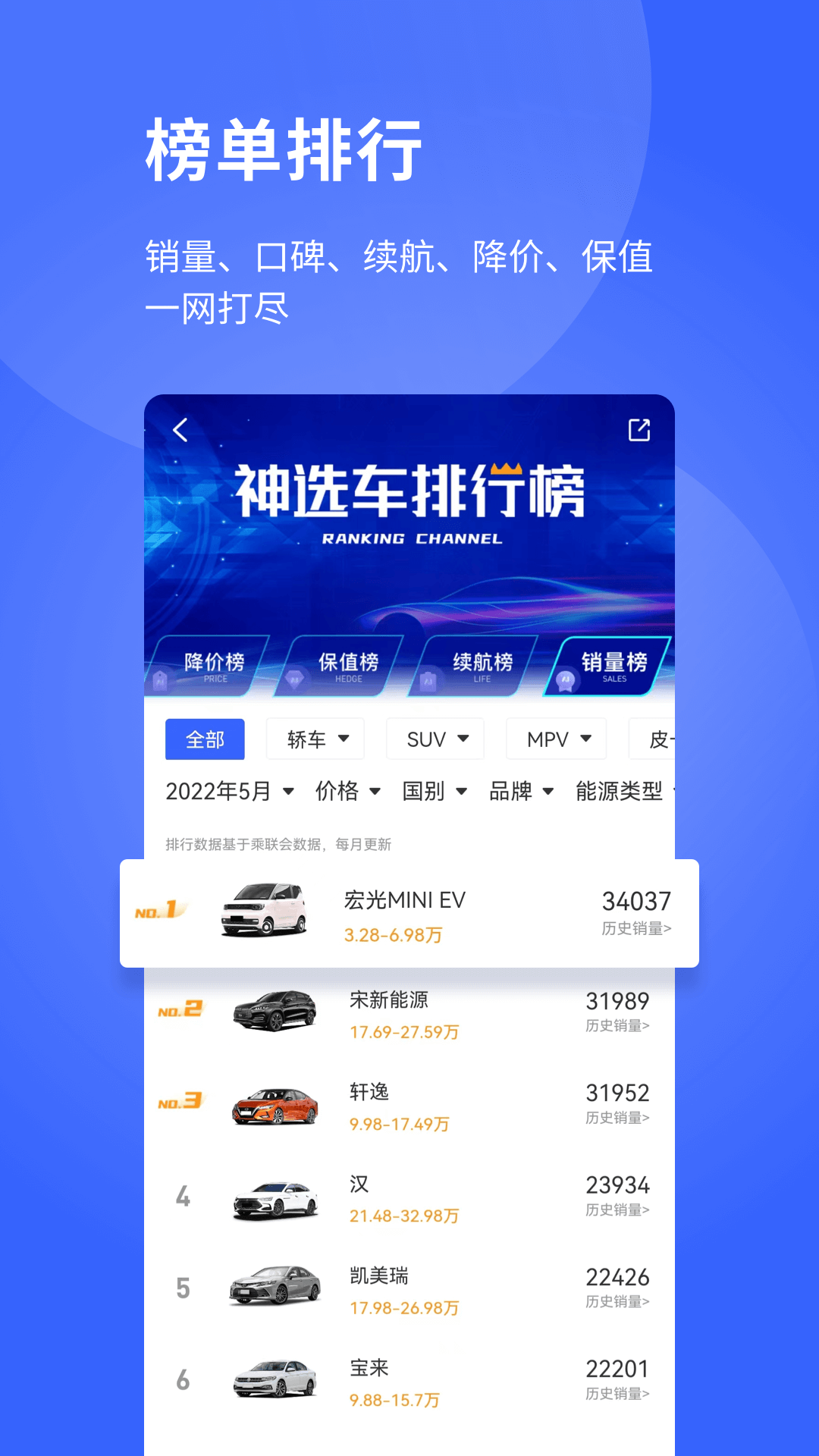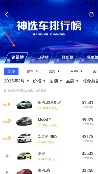 2、神选车排行榜界面呈现销量榜等榜单展示2025年3月车型数据宋PLUS新能源等车在列销量信息一目了然。