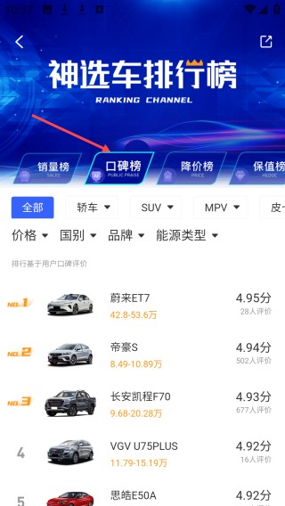 3、神选车排行榜之口碑榜依据用户评价排行蔚来ET7等车型在列显示评分价格与评价人数助消费者了解车口碑。