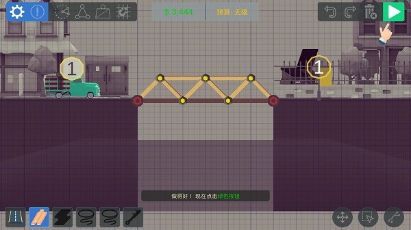 一切建设完成后,通过点击右上角上方的“绿色”播放按钮进行桥梁稳定性的测试。