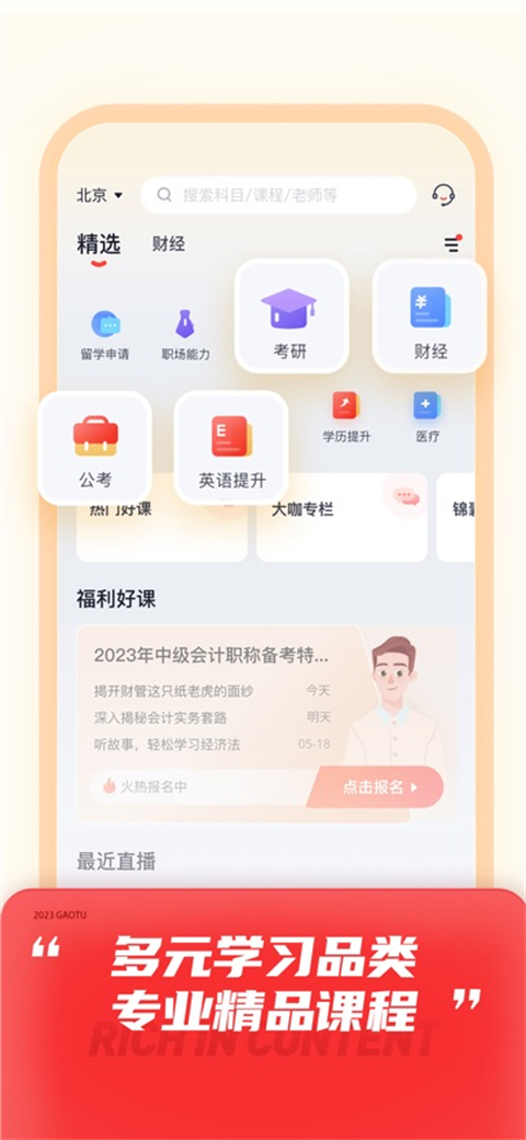 近课考研是一款专门给考生设计的学习软件,软件覆盖了大量课程,还有近课直播,在线就可以进行学习,软件的院校都是非常齐全的,覆盖了各大院校,15年以上顶尖名师授课,还有专硕全国院校库,能够智能选择学校,软件有个性化学习报告以及考试分析等功能,软件会根据历年真题、命题方向、考研大纲保障学员的学习效果,可以站在院校的角度帮考生准确定位。