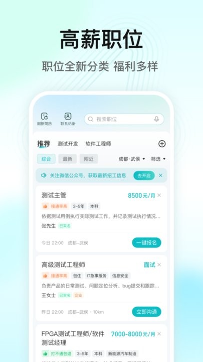 岗位免费发布试用,招人真的快,轻松找到优质牛人!智能算法匹配求职者和职位,招的放心,找的快捷!