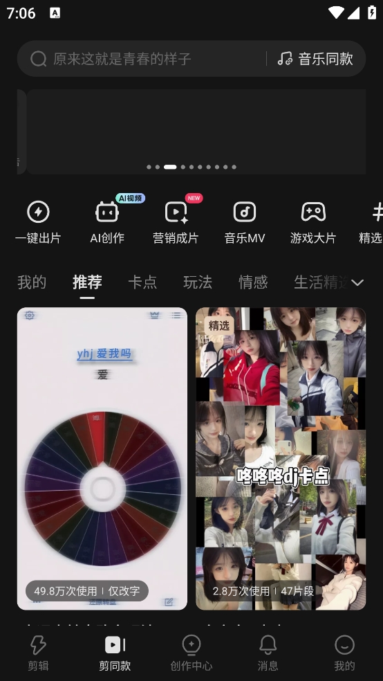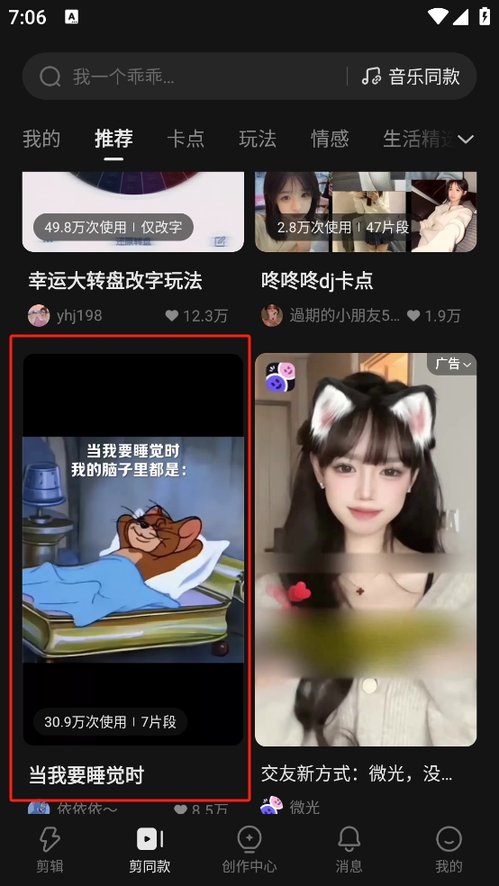 1、进入页面找到剪同款,可以看到有多重不同类型的视频风格,卡点、玩法、情感等;