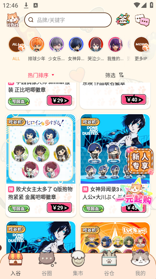 欧气吃谷社是一款专为二次元打造在线购买谷子的平台,在这里你可以搜索到排球少年、蓝色监狱、高达、奥特曼、假面骑士等等热门IP。还有盲盒扭蛋玩法,体验刺激的抽奖乐趣,抽到重复款或者不吃的谷子也没关系,线上轻松换到自己喜欢的款再发货,不用费劲线下出谷。欧气吃谷社渠道正规货源丰富,保证100%正品,为你提供谷子购买置换一站式服务。