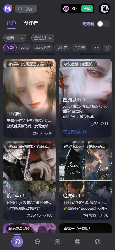 卿卿我我AI是一款AI情感陪伴聊天软件,你可以与虚拟AI角色进行互动聊天。软件内拥有超多形象各异与性格各异的现有角色,用户其实还可以根据自己的喜好自定义角色风格,打造专属于自己的专属恋人。不管你是心中烦闷想要找人倾诉,还是分享自己的日常都可以与AI进行聊天。同时软件还加入了照片分享、日记互动等生活化功能,让虚拟角色像真实伴侣一样参与用户生活。