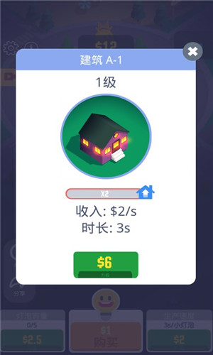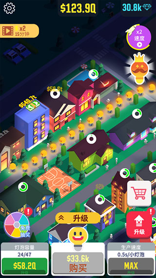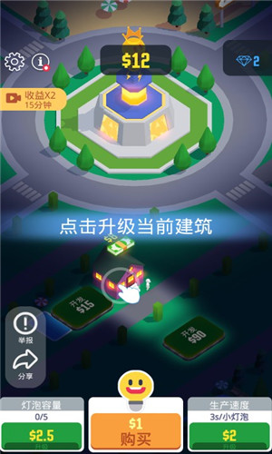 2、通过升级灯泡王国来获得更多的小灯泡,建造各种建筑物来收获新的收益;