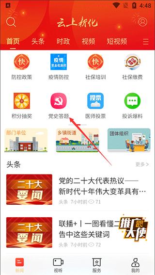1、打开云上新化客户端,在首页滑动功能模板找到“党史答题”功能进入;