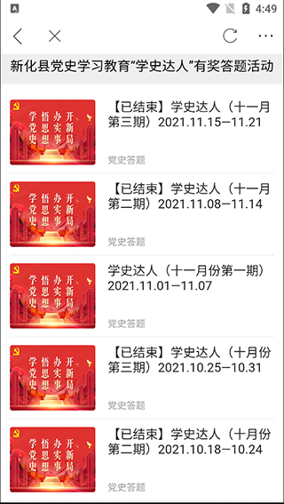 2、进入后你就能看到“新化县党史学习教育有奖答题获得”,下滑可以查看历史答题期数;