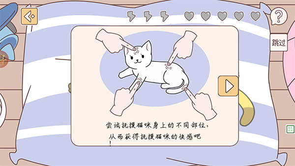 2、平常的时候我们可以和猫咪贴贴,通过点击猫咪的不同部位来抚摸猫咪,不过要注意,有些部位点到了可是会让猫咪炸毛哦。