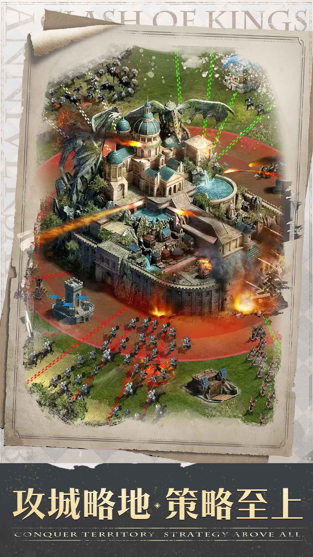 在这个战火纷飞的世界里,你将扮演一位雄心勃勃的城堡领主,从一座小小的城镇开始,逐步发展壮大,建造坚固的城墙,提升资源产量,训练骁勇善战的军团,培养强大的巨龙和传奇英雄,发展科技秘术,最终在这乱世中建立你的强大帝国,成为真正的列王之王!