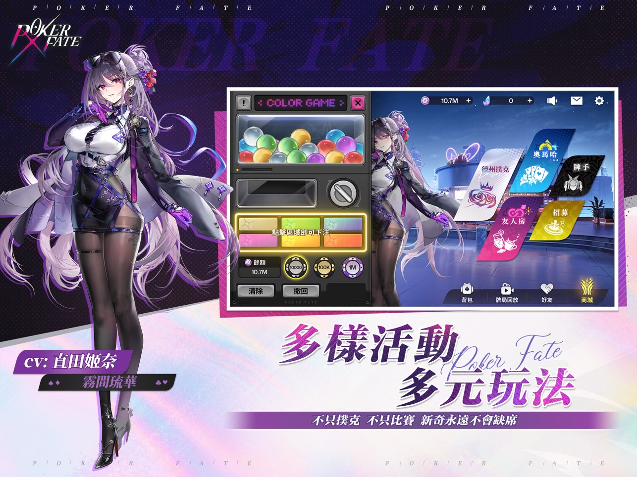 《扑克命运日服》是一款结合了德州扑克玩法与二次元美少女风格的卡牌桌游策略竞技游戏。通过这款游戏,玩家们可以畅享德州扑克的乐趣,每位玩家发两张底牌,与五张公共牌组合成最强的牌型。玩家将会遇到专属的美少女棋牌手,并于她们开启命运对决。游戏中美少女角色多多,玩家可以收集养成她们,通过各种养成事件来加深彼此的羁绊,每位角色还有专属的故事线和配音,十分具有沉浸感和代入感。同时,游戏支持在线联机功能,可以和朋友们开房间一起畅玩,享受游戏的乐趣。