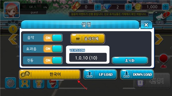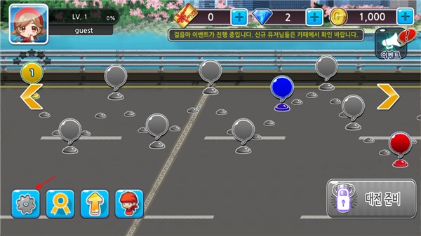 1、初次进入游戏界面默认语言为韩文,先点击左下角的齿轮进入设置。