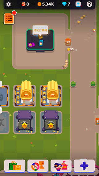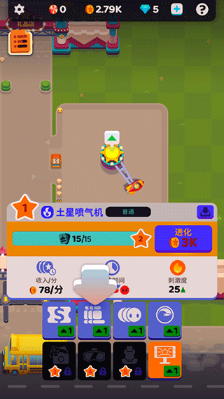 3、放置好的游乐设施后,就会有游客来游玩,图示上小表情就是游客,点击设施上的“绿色箭头”继续升级;