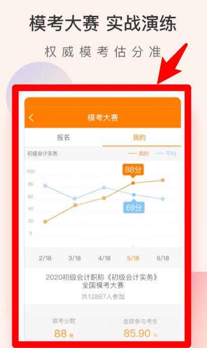 4、通过“模考大赛”功能查看个人模拟成绩与全国平均分对比,帮助掌握学习进度和水平。