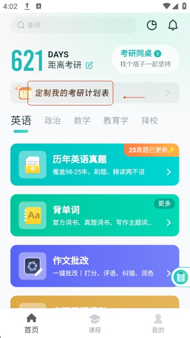 用户们可以点击“定制我的考研计划表”定制计划,开启计划性备考之旅