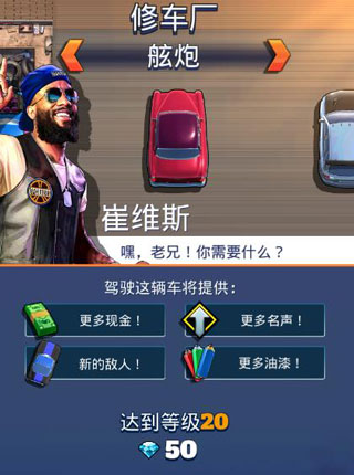 每升10级都可以用钻石解锁更强的车辆,且解锁的车辆会为你提供更多的现金、名声、敌人和油漆。