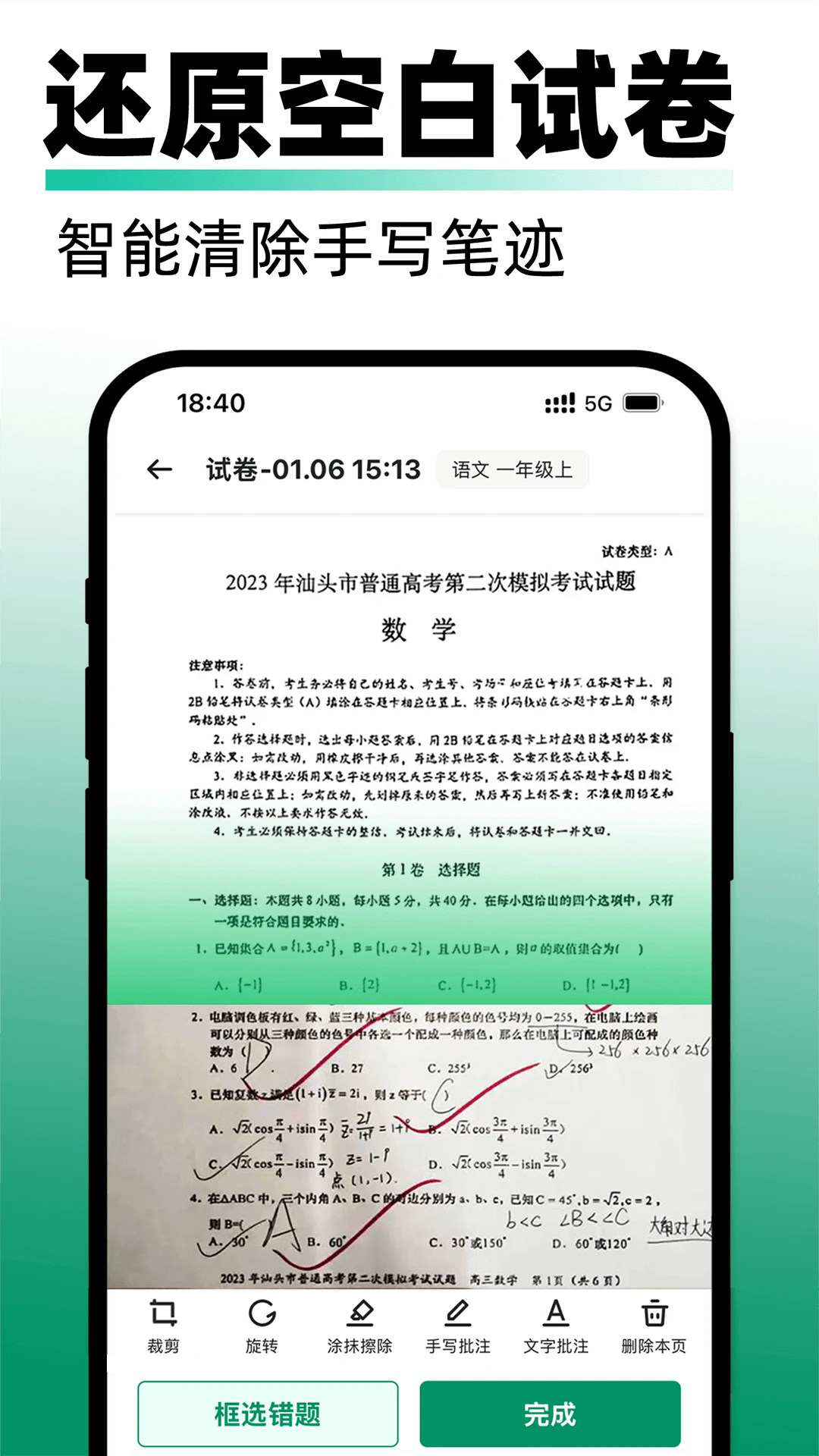 1、试卷还原:自动清除笔迹,高精度还原空白试卷。
