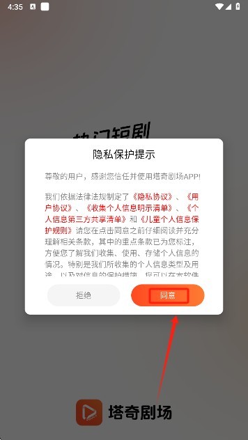 1、打开软件同意相关的隐私保护规定。