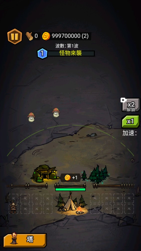 1、开始游戏后,玩家小人会自动采集金币,怪物来袭后会停止采集。击杀怪物能掉落木材,而木材可以升级防御塔