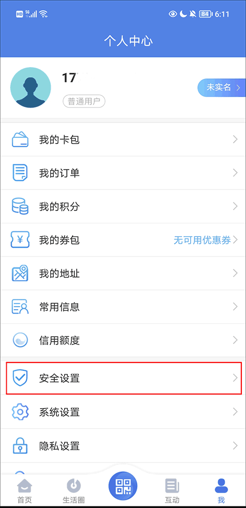 1、打开应用,在“我”的个人中心界面中找到并点击“安全设置”选项;