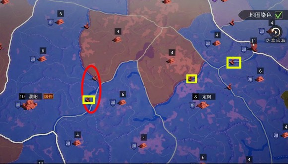 我们以兖州码头为例,如果我是兖州散人盟指挥,首先我会让队员占领图中黄色标记码头,如果有幸占领以上三个码头,码头以北的全部城市将尽数归于我手(如果我盟的意向是北进冀州),南部城市的敌军将无法通过码头进行调动,而北方的少部分敌军将会被我全盟主力分别打飞,黄河以北将再无战事。