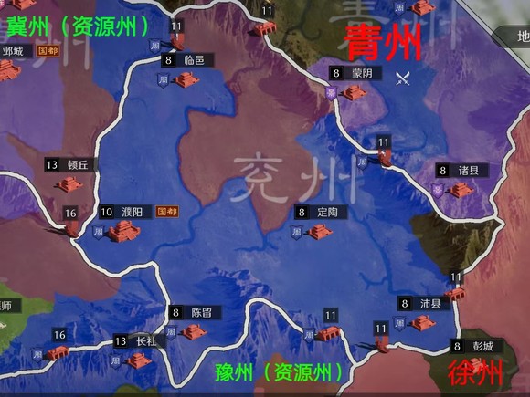 兖州,游戏中州府为濮阳,在今山东金乡西北。辖境相当于今山东西南及河南东部,连青冀豫徐,当四战之地也。因其地理特性,在S1阶段不建议散人盟入驻,首先我认为在非航母区的前提下,如果假设各州落州玩家实力、活跃、人数接近,那么兖州的胃口未免太大了,在S1阶段,同州的散人盟很难在资源州关口开放前完成州内整合(当然PY大师除外,你反驳就是你对~),那么基于此,虽然兖州连接了两个不同的资源州,北连接冀州、南连接豫州,但一旦资源州关口打开,州内有生力量将会大打折扣,很难对幽州的整合盟形成有效打击,那么此时对于北上的兖州军来说,同样是单资源州关口进冀州的并州军其意识形态就很重要。同理:南下豫州的兖州军更应提前与东进的荆州军在豫州会师,以面对扬州方面的威胁。