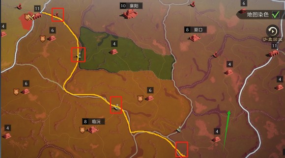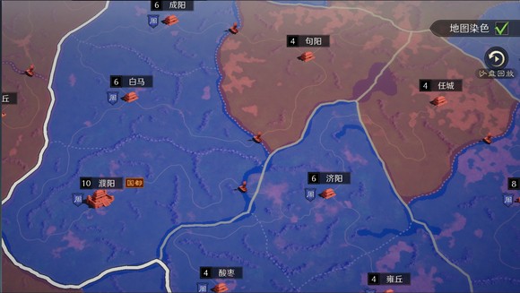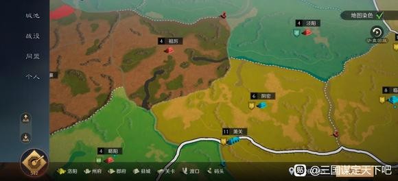 勾选右上角“地图染色”会以不同的颜色显示各同盟的占领范围。