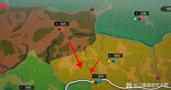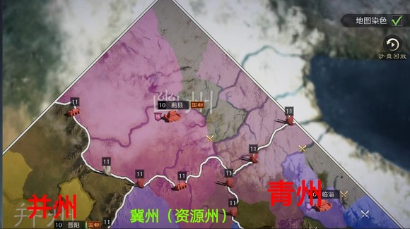 接下来分析一下并州开局,并州州府晋阳位于并州中心,西侧与龟兹接壤,北侧与九原接壤(战略优先级)且州府与两个资源州关口的距离相对较远,这也诠释了三谋的游戏特性,对于指挥的临场指挥考验更大,因为一旦我方在州府战斗之中取得胜利,那么敌军完全可以放弃州府争夺转而布局资源关口,东侧沾县连接壶关(冀州),南侧平阳连接龙门渡(雍州)。也就是说,在并州的战斗,州府的优先级要较次于其他出生州的州府,因为在大战略的背景下(比如我方需要进冀州驰援),一旦敌军在州府失利的前提下提前布局关口,极大可能会使我方被迫战略转移,在两方势力均衡的情况下强攻将会损失进入资源州的最佳时机。因此并州的关口城市就显得更为重要了。并州城市优先级:沾县=平阳>龟兹=九原