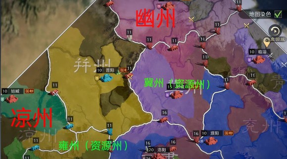 2. 其余各出生州府,均只接壤一个资源州(两个资源州关口连接同一个资源州),幽州青州连接冀州;徐州扬州连接豫州;凉州益州连接雍州。
