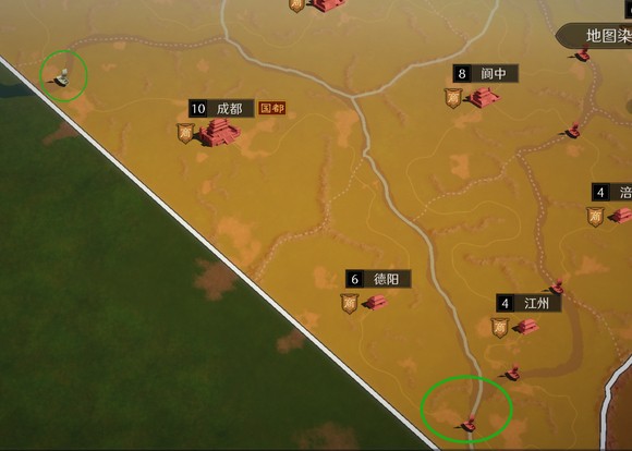 接下来我们谈谈益州的州内战争布局。首先如果想将益州一分为二,需要先行占领图中的三个黄色码头,而最下面的黄色码头是连接州府成都的建筑,因此优先级格外重要。然而,由于益州的地理环境,即使我占领了这三个码头,但散关(雍州资源州关口)却没能实现闭环,没有办法将敌军消灭在出生州之内(没有办法,如果我们设想凉州为敌荆州为友的话,散关距离凉州太近了,且资源州还在凉州一侧,如果我是益州指挥且两方实力均衡的情况下,散关将会成为我的弃子。但这并不影响我对大战略的布局,因为成都真的太重要了,益州是一个非常适合打逆风的出生州,通过第二张图我们可以看到,如果想守成都,那德阳也将会是我不能放弃的一座城,我们把成都和德阳看做一体,那连接这两座城市的道路将只有两个码头(意味着在没有友盟设定的情况下,只有两个敌盟会与我接触)。州府的居民容量是45人,德阳35人,如果我能吸纳80人的盟内高战并命令外围盟友进行袭扰,会给敌军造成很大困扰。(终测出生州BUFF取消了,如果在浪花测试,这样的布局近乎铁桶)。因此益州的开局优先级为:下方黄色码头>西城>德阳。(这样的布局是基于常规化的友荆敌凉,战场态势会随意变化,如果是相反状况,有机会我们再另行分析)。