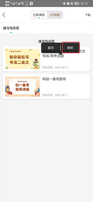 二、在你要删除的课程上长按后会显示出置顶/删除,点击删除。
