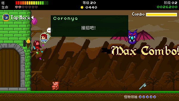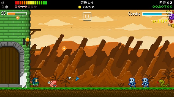 每个关卡都有独特的背景以及Boss,这对于一部像素游戏而言尤其难得唯一的不同,却是“根本”不同:“塔”是你的老家,除此之外没有任何的防御设施可供布设。左手上下滑动屏幕,控制英雄在4个(含地面)平台之间运动,右手连续触屏发射武器,以这种“上下逢源”的方式迎战空地一体进攻的敌人。你可以将其理解为丧尸从4条“车道”进发,而你的“豌豆射手”只有一个!