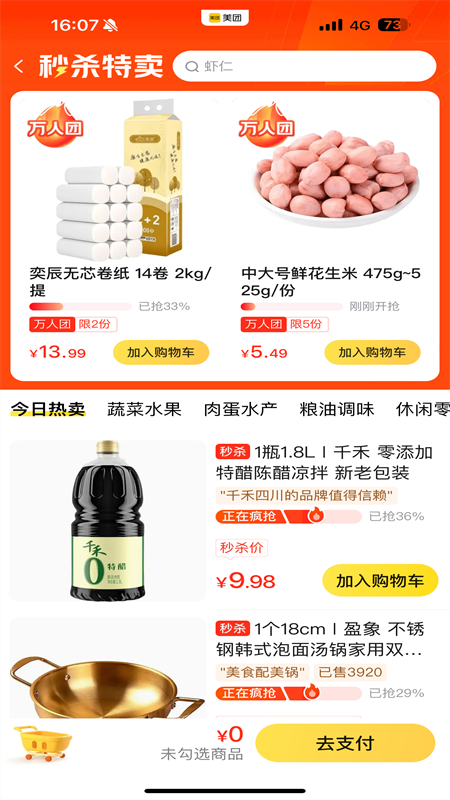 【便宜有好货】我们为社优化购物及支付体验区家庭用户精选高性价比的蔬菜、水果、肉禽蛋、酒水零食、家居厨卫、速食冻品、粮油调味等品类商品,解决一日三餐所需货品。