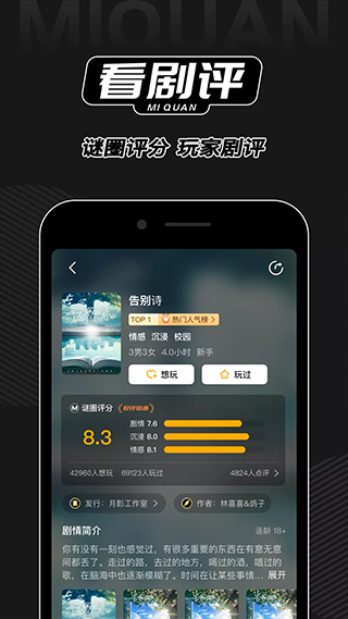 谜圈是一款线上线下相结合剧本杀社交软件,你可以在线查询剧本杀社交圈资讯,实时掌握剧本动态查看剧本评分,不错过优秀作品也可以避雷低分剧本。在这里也可以在线查找附近剧本杀玩家同城组局,提供邀约组队查看队友信息等功能,不用再担心约不齐剧本玩家,这里还有超多优惠等你领取。