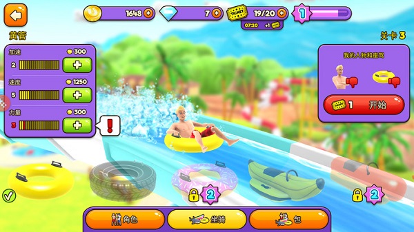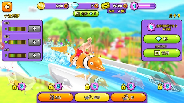 游戏开始时可以选择自己的角色、坐骑,并且可以升级坐骑的功能。可以升级的部分主要有三个:加速、速度、力量。建议优先升级加速和速度,因为游戏中很多关卡的钻石在高空、水底,需要足够的速度来“上天”或“入海”。