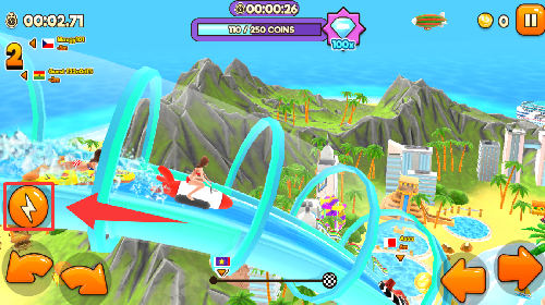 游戏中主要以水上乐园中的管道为路径,通过吃到游戏中的金币和造成破坏来获得金币,游戏中会有隐藏的钻石,一般是在高空或者水底。游戏中需要注意通过加速后容易“起飞”,而且游戏中的物理引擎比较“反牛顿”,所以在空中保持好平衡或者翻转之后保证不用脸去刹车是保命的关键。主要通过左下角的翻转来控制空中的行动,右下角的前后代表加速和减速,在空中时也有一定的控制效果,但是并不强烈。游戏中也有计时功能,通过右上角来查看时间,通关时间越快越容易进入排行榜。