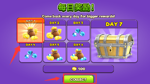 1、进入游戏会弹出每日奖励并领取。