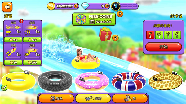 1、游戏中拥有多种不同的角色人物,也拥有许多的不一样的道具物品,玩家让角色选择合适道具进行水上冲刺。