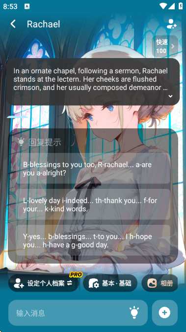 5、用户可调整AI回应内容,且提供“PRO设定个人档案”“相册”等功能入口,便于完善个人信息、管理互动中的图片内容。