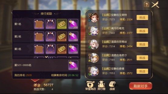 竞技场是采用排名互换机制,即低排名玩家挑战高排名玩家并获胜,即可互换彼此排名。